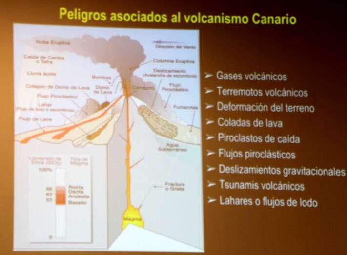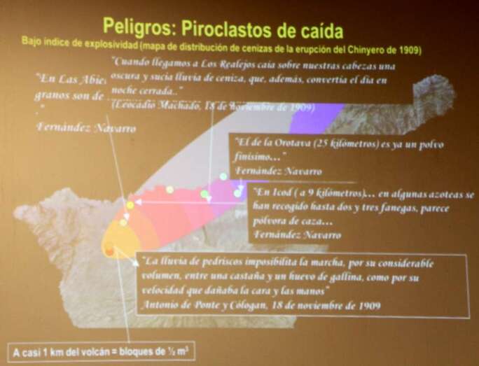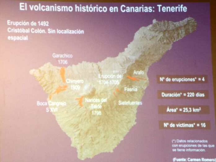 Una primera exposición temática que el técnico del ITER, Graduado en Geología, Rubén García Hernández, en su primera intervención expuso ampliamente con la previa proyección de un video documental realizado en los años noventa que nace de la erupción en el Nevado del Ruiz en 1985, en Colombia, provocando la muerte a 23.000 personas, en el pueblo de Armero, cubierto por los lahares, flujos de lodo y escombros, que suponen fuertes amenazas para la vida humana y el medio ambiente. En este caso la situación se agravó por la falta de alertas tempranas y de preparación de la población para actuar. Entre otras imágenes contextualizaron perfectamente la disposición geográfica, orígenes, características de las diferentes manifestaciones geológicas, químicas y orográficas, así como las diferentes etapas, desarrollo y consecuencias en el escenario geográfico donde se sitúan sus acciones, efectos devastadores sobre el medio ambiente, con las consecuentes catástrofes sobre la población.