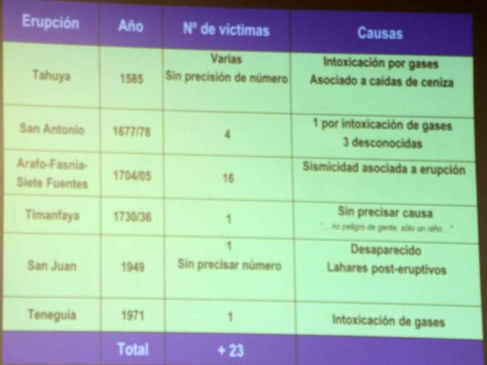 En la isla de El Hierro solo hubo la erupción histórica del volcán submarino conocida en el 2011. Hubo una erupción en Lomo Negro en 1793, aunque se ha deducido a partir del análisis de la edad de las rocas. Todos los peligros vistos ante esta situación han tenido lugar en Canarias, lavas, cenizas, deslizamientos, tsunamis, terremotos, en estas erupciones históricas el número de víctimas ascendió a 23 víctimas y las causas que más han afectado a la población han sido los terremotos, sismicidad asociada a la erupción causante de la destrucción de viviendas con infraestructuras no preparadas, campos de cultivo, desprendimientos de tierra, disminución del caudal de las aguas, hundimientos de tejados, desplomes de edificios, el riesgo volcánico ha aumentado pero por el propio crecimiento de la población.