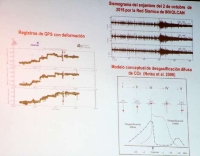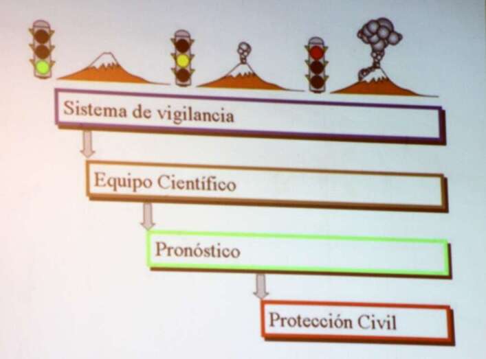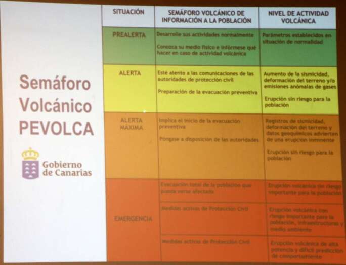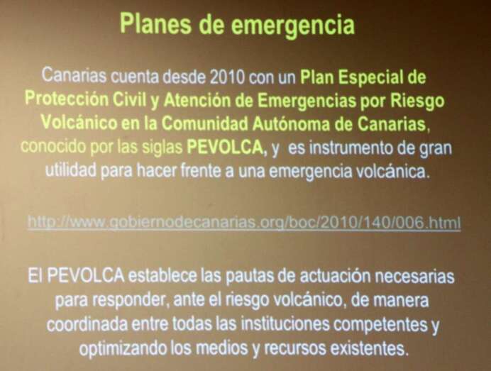 Las conferencias finalizan con la exposición de los programas geofísicos de sismicidad y localización de eventos sísmicos, termometría y termografía, evolución temporal de la temperatura y contenido de agua en el suelo, evolución del flujo de calor, programa geoquímico, gases+agua, Helio, control de la emisión difusa de Dióxido de Carbono CO2 y de Hidrógeno H2, presión barométrica, programa geodésico de deformación, registros de GPS con o sin deformación. En referencia a las alertas, PEVOLCA informa de un semáforo volcánico de información a la población situaciones de prealerta, alerta, alerta máxima y emergencia según niveles de actividad volcánica. Canarias cuenta desde 2010 con un Plan Especial de Protección Civil y Atención de Emergencias por Riesgo Volcánico en la Comunidad Autónoma de Canarias, conocido por las siglas PEVOLCA, y es un instrumento de gran utilidad para hacer frente a una emergencia volcánica. El PEVOLCA establece las pautas de actuación necesarias para responder, ante el riesgo volcánico, de manera coordinada entre todas las instituciones competentes y optimizando los medios y recursos existentes.