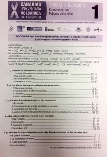 Durante este programa en cada jornada se propone un cuestionario a modo de trivial volcánico, que se realiza después de las ponencias con las respuestas de los asistentes escogiendo las adecuadas soluciones a los interrogantes de los temas tratados, diseñados para evaluar el impacto del evento y para mejorar los programas futuros. Dicho ejercicio indica la comprensión del público sobre el monográfico que sitúa en diferentes escalas de importancia y peligrosidad la actuación de los planes y posibles afectados por estas previsibles situaciones, aunque en otros casos, por diferentes circunstancias de la inminencia del momento y el transcurso de la evolución volcánica han sido imposible prever.