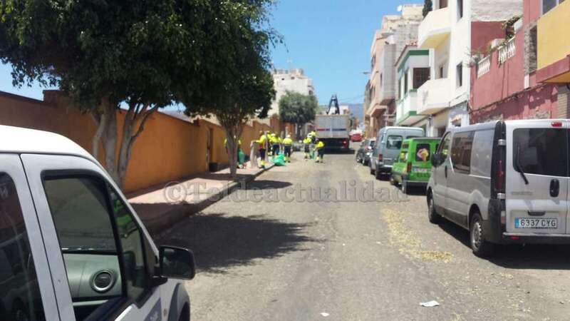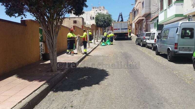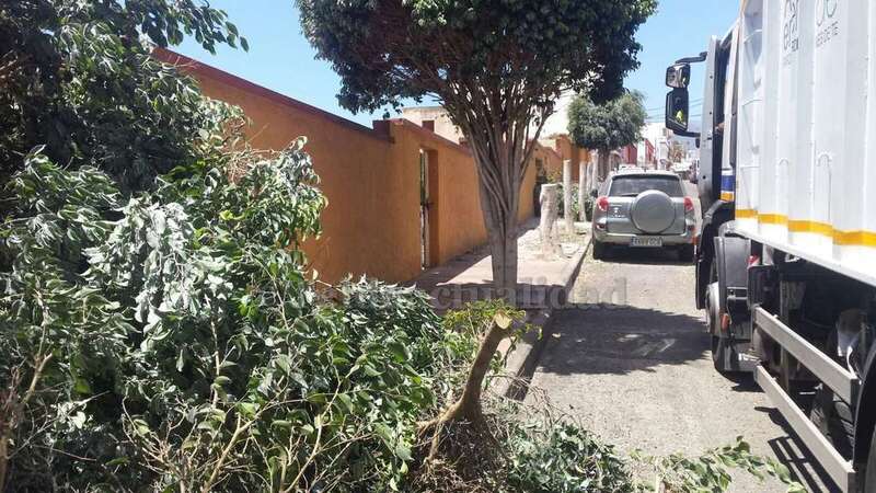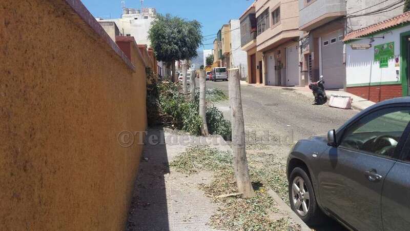 Con las copas de los árboles sobre la acera, cortadas a medio tronco, y el suelo lleno de hojas y ramas. De esta guisa encontraron este lunes los seis ficus benjamines que adornan la calle de La Rocha. Una cuadrilla de trabajadores de la empresa FCC, que presta el servicio de Parques y Jardines para el Ayuntamiento de Telde, había acudido al barrio para ejecutar diversos trabajos de poda y conservación de los ornatos vegetales.
