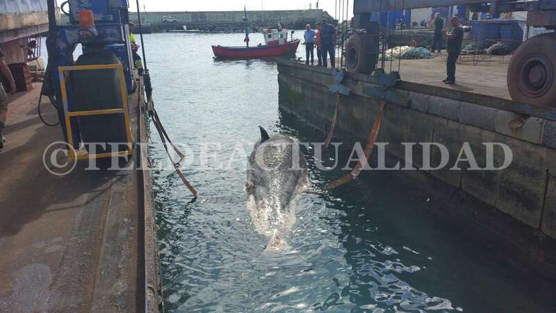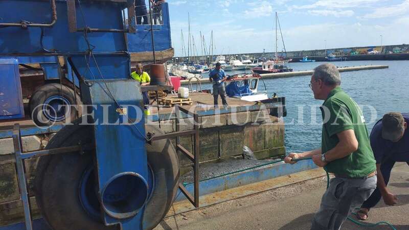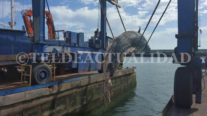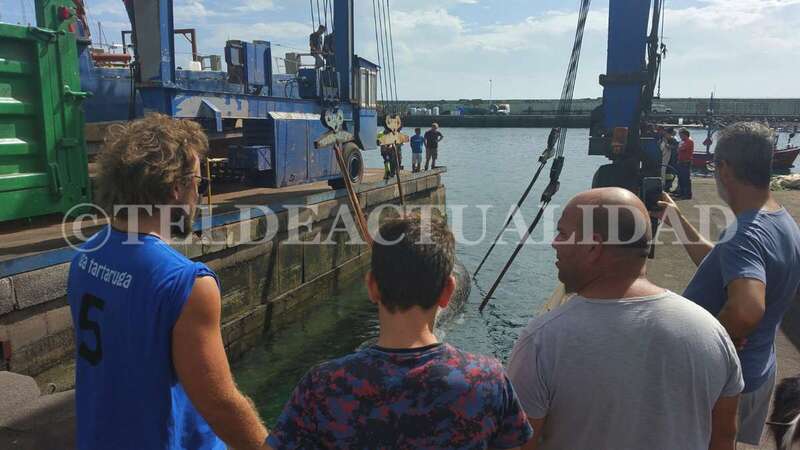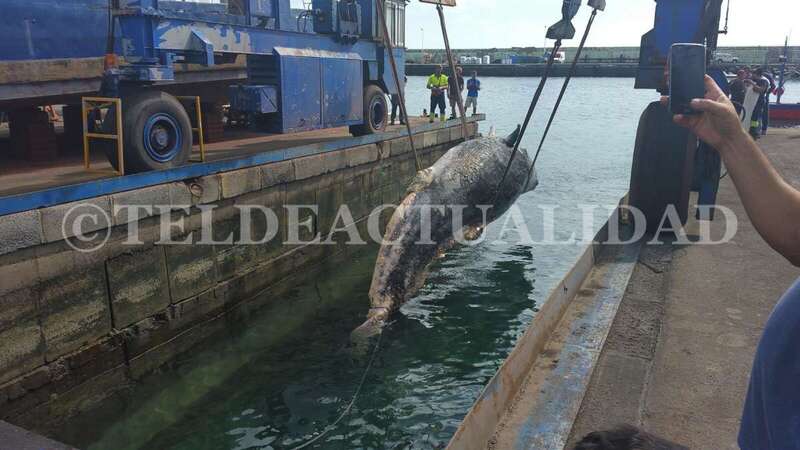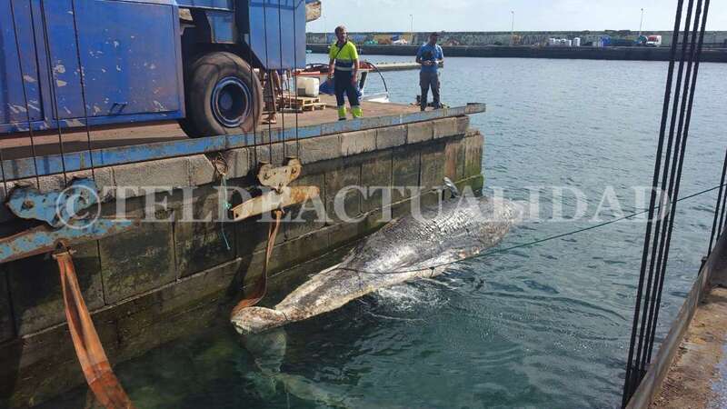 Para la operación de izado se empleó una de las grúas fijas de gran tonelaje que habitualmente que se utilizan para varar a los barcos pesqueros o de recreo que tienen su base en este puerto de la costa teldense. Con dos eslingas se sacó del agua al cachalote y se depositó sobre un pequeño camión.