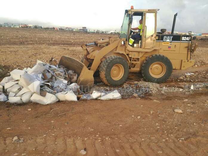 Telde.- Operarios de Servicios Municipales, con la ayuda de un tractor y de un camión, ha procedido esta mañana, hace unos pocos minutos, a retirar las cajas de pescado halladas este sábado tiradas en puntos de Tufia y Barranco Real de Telde, tal y como avanzó TELDEACTUALIDAD. Serán llevadas al vertedero de Juan Grande.