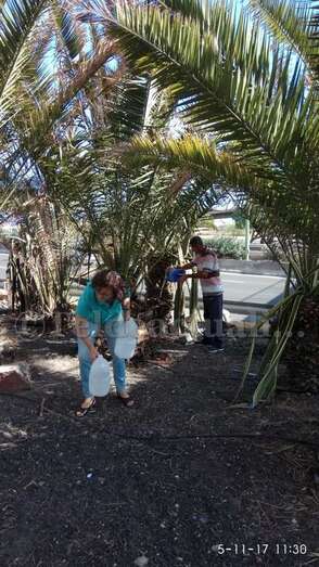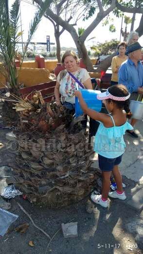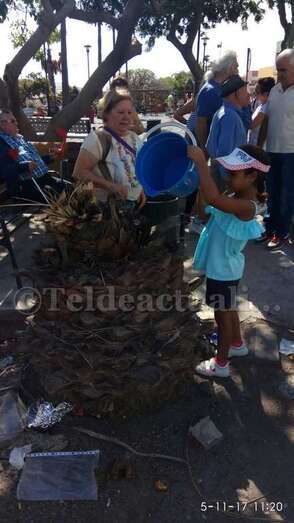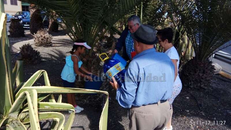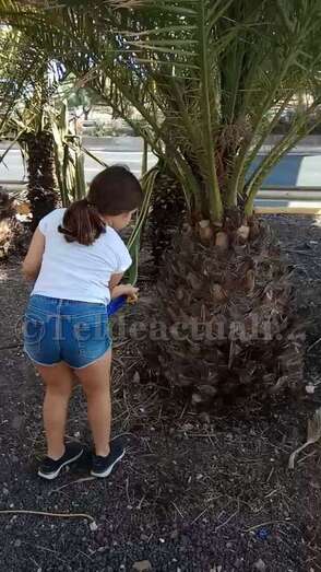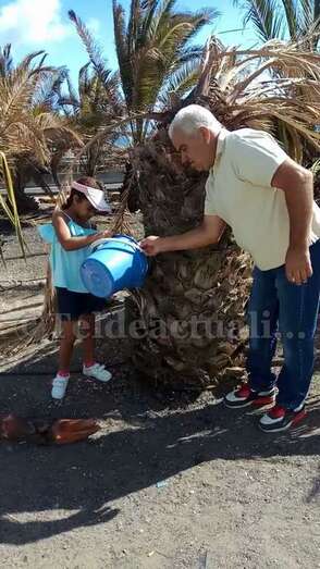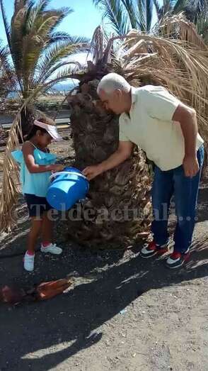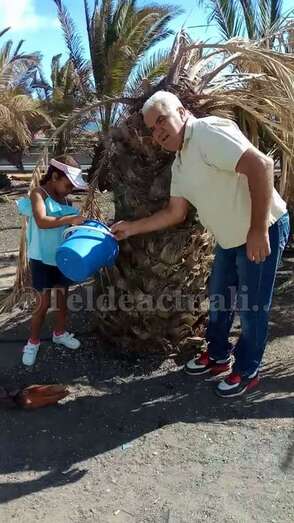A las 11 de la mañana de este domingo, tal y como adelantó TELDEACTUALIDAD, vecinos provistos de recipientes de plástico llenos de agua llevaron a cabo un riego simbólico de estos ejemplares de la vegetación canaria que se mueren por la falta de cuidados, pese a tener un sistema de irrigación por goteo que no funciona.