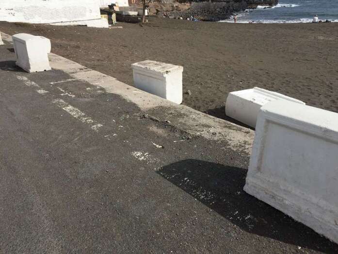 Los mismos usuarios han avisado también de la caída a la arena de dos malecones blancos que estaban colocados a modo de protección en el camino asfaltado que rodea el edificio El Timón.