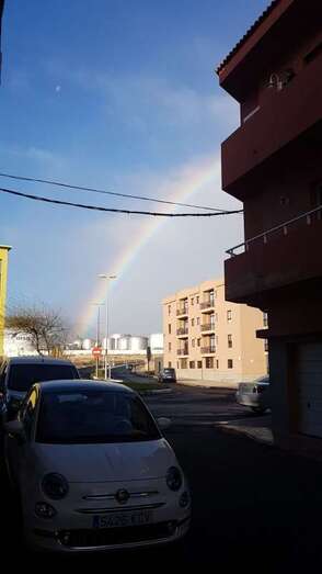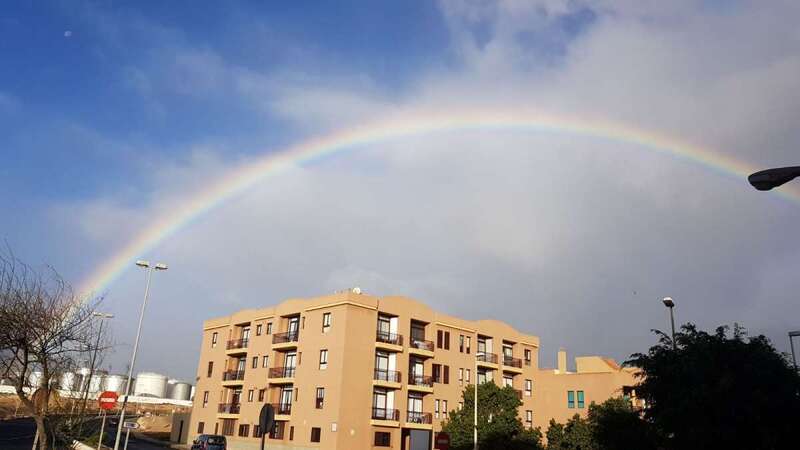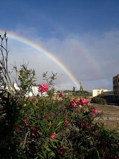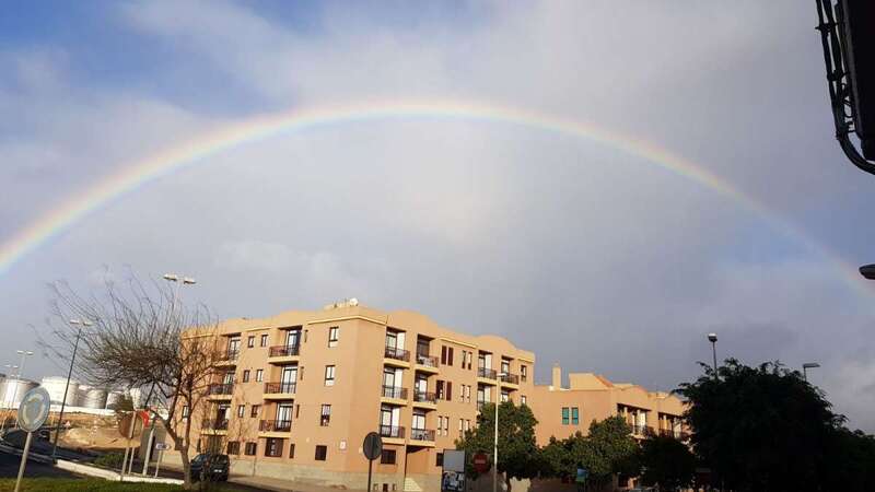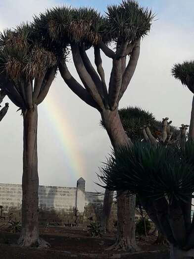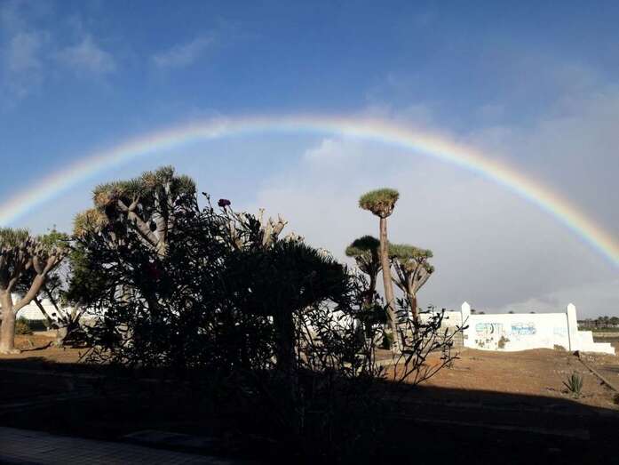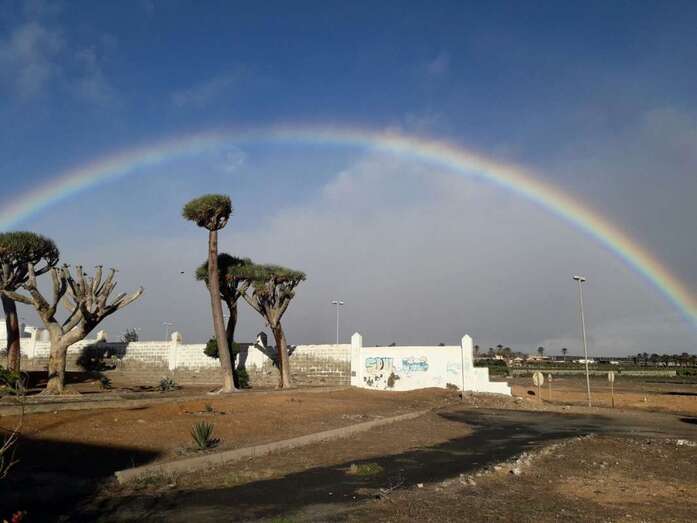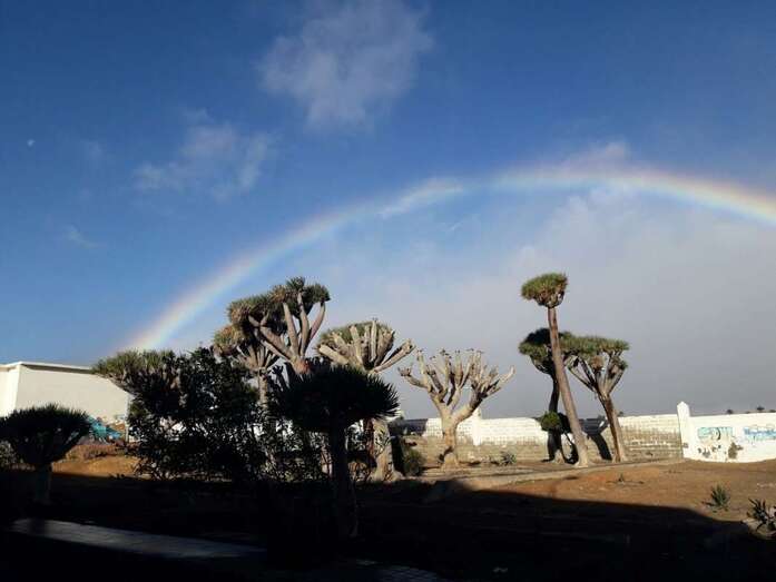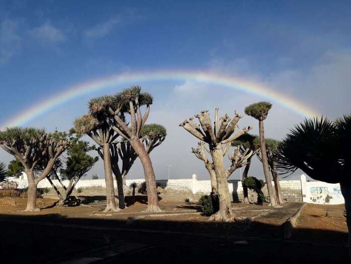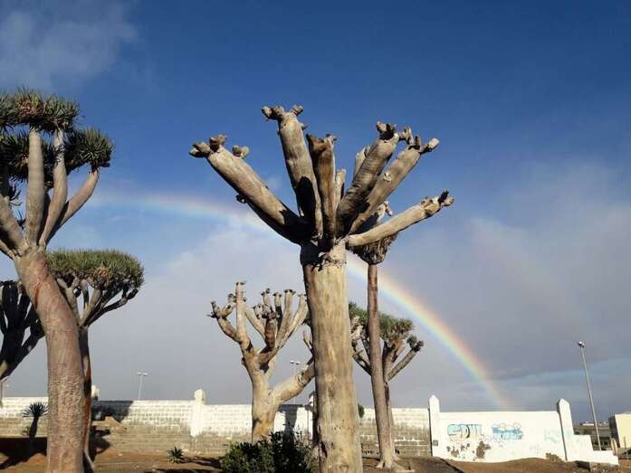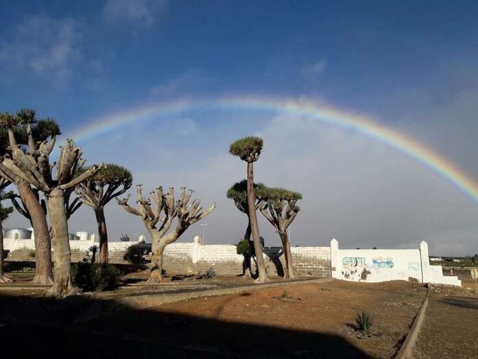 Telde.- Un bello arcoíris surcó el cielo de Telde a primera hora de esta mañana. El espectro luminoso de colores jugueteó con los ejemplares que aún sobreviven en el dragonal de Salinetas.