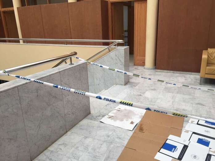 En Telde no ha parado de llover de forma ligera durante la última en todo el municipio. Lo hace de forma sosegada porque apenas sopla viento. Las precipitaciones, eso sí, han puesto al descubierto las goteras que desde hace tiempo existen en la estructura de cristal y madera que conforma la cubierta de la sede principal del Ayuntamiento, en San Juan. El espacio afectado por las filtraciones, un rellano de la segunda planta, ha tenido que ser deslindado por cintas que advierten de la caída de gotas y suelo resbaladizo.
