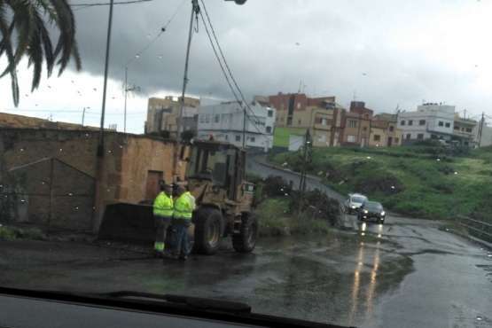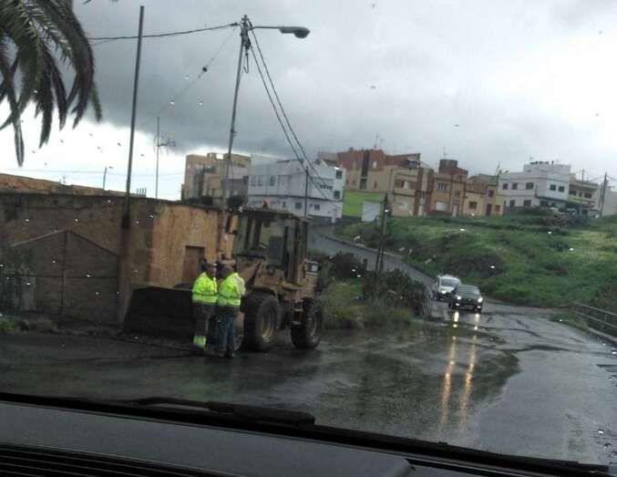 Un tractor y una cuadrilla de operarios del Ayuntamiento de Telde se ha desplazado hasta el barranco de Las Bachilleras para intentar evitar que el caudal de agua desborde el cauce e invada la carretera, lo que conllevaría el cierre de esta vía y también que el núcleo de El Caracol se quedara aislado, como ya sucediera en el episodio de lluvias torrenciales que anegó la ciudad de Telde en octubre de 2015.