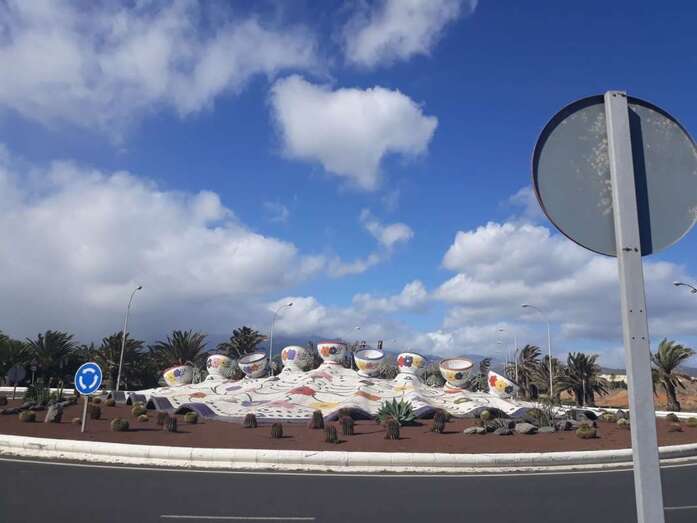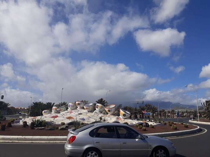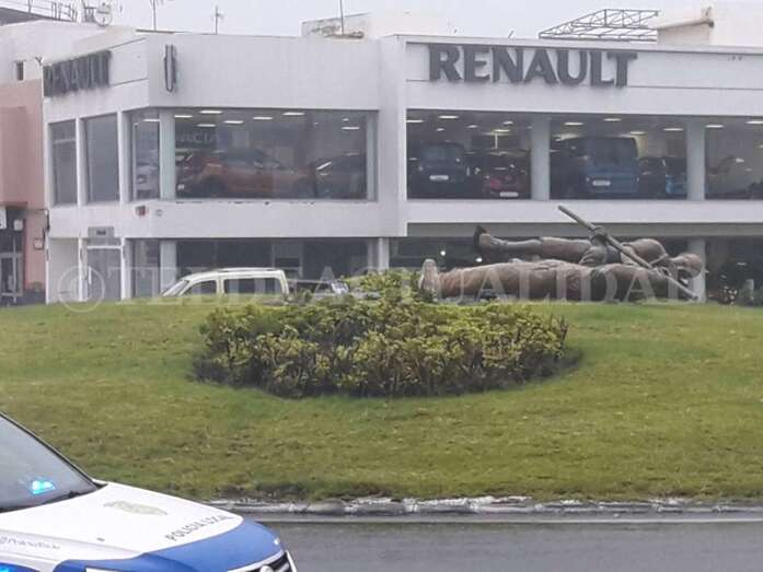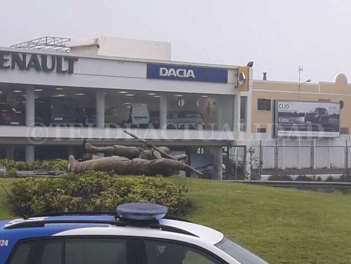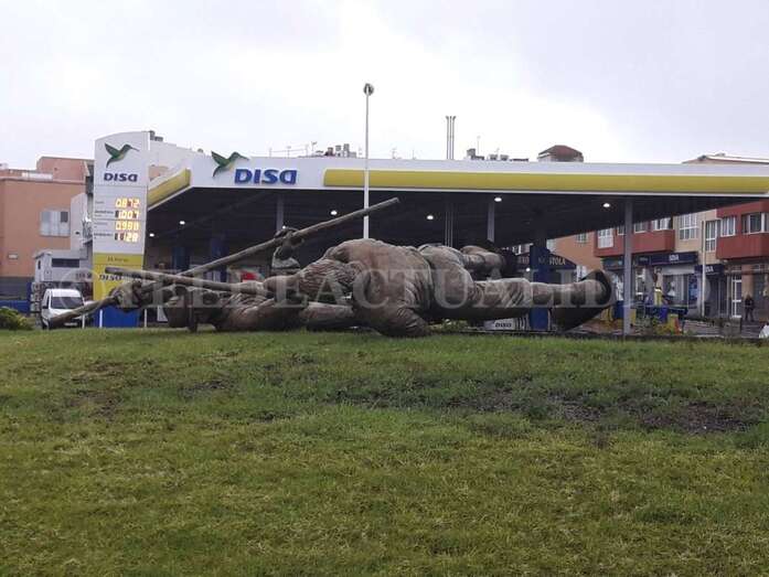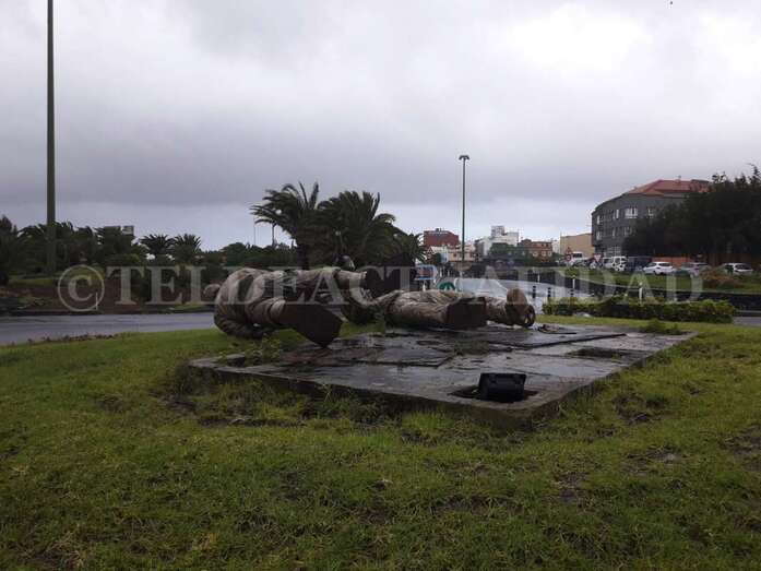El fuerte viento que ya sopla en la ciudad de Telde, con rachas de hasta 74 kilómetros por hora en la zona del Aeropuerto, ha derribado la escultura del Juego del Palo que preside la rotonda del Cruce de Melenara. El conjunto escultórico, realizado en fibra de vidrio y formado por dos figuras de unos cinco metros de altura, no pudo soportar el embate del acabó sobre el césped de la glorieta.