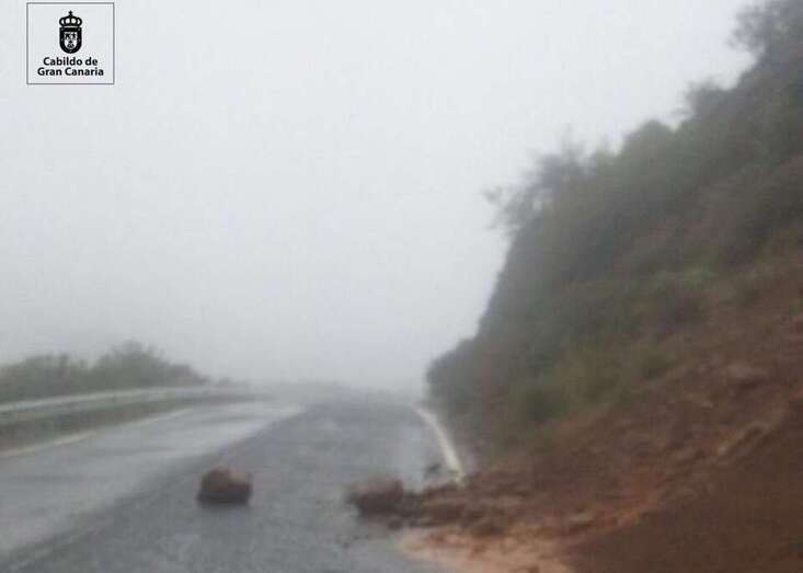 El servicio de Carreteras del Cabildo de Gran Canaria advierte de que el mal tiempo está ocasionando desprendimientos en las vías de medianías y cumbres de la Isla. Uno de los ellos se produjo a primera hora de esta tarde en el tramo que va de Los Pechos al pago cumbrero teldense de Cazadores, en el kilómetro 8 de la GC-130