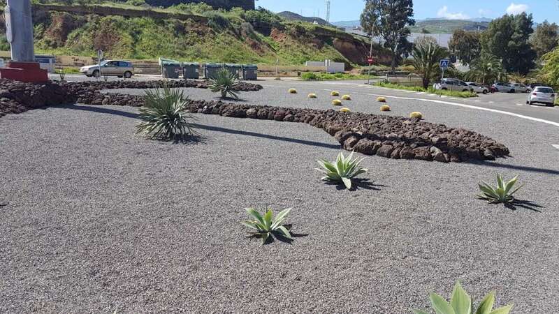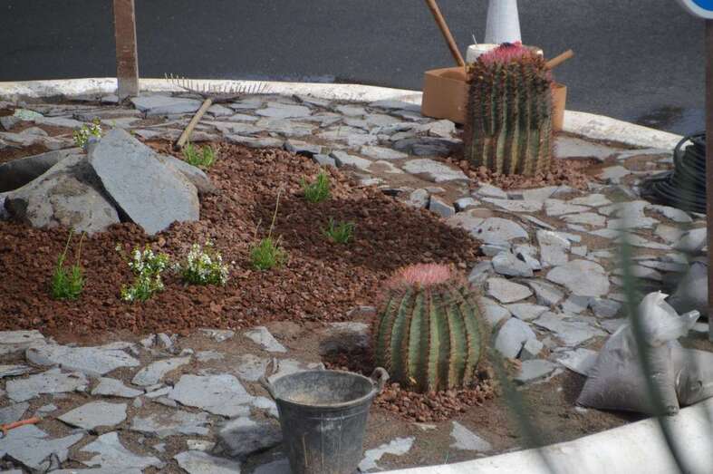 En este espacio de Jinámar, así como en las rotondas que hay en los accesos a San Juan desde La Pardilla, se están colocando plantas crasas canarias, picón y piedra, una vegetación y un material que requiere un mínimo mantenimiento y se adapta con facilidad a estos lugares.