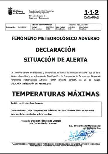 Telde.- Toda la Isla de Gran Canaria se encuentra desde las ocho de la mañana de este lunes bajo alerta por temperaturas máximas, con previsiones de hasta 38º centígrados en algunas zonas de interior, medianías y cumbre.