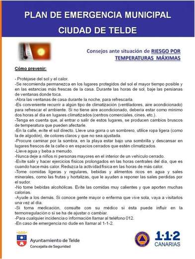 El Ayuntamiento aconseja a la ciudadanía que permanezca en lugares protegidos de la radiación solar el mayor tiempo posible y que durante las horas de sol se mantengan las persianas de las casas bajadas. En la calle, debe evitarse el sol directo y, preferiblemente, utilizar ropa ligera de color claro y sombreros.