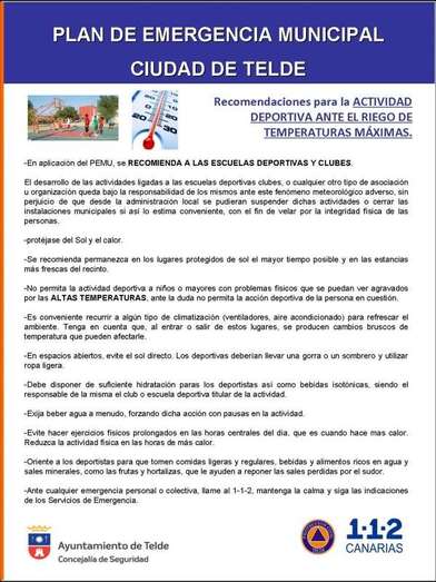 También se apunta evitar las actividades deportivas o de salidas de excursiones o visitas en el exterior en las horas más calurosas y realizarlas a primeras horas del día o a última horas de la tarde, aparte de protegerse del sol y tomar bebidas que repongan líquidos y sales minerales.