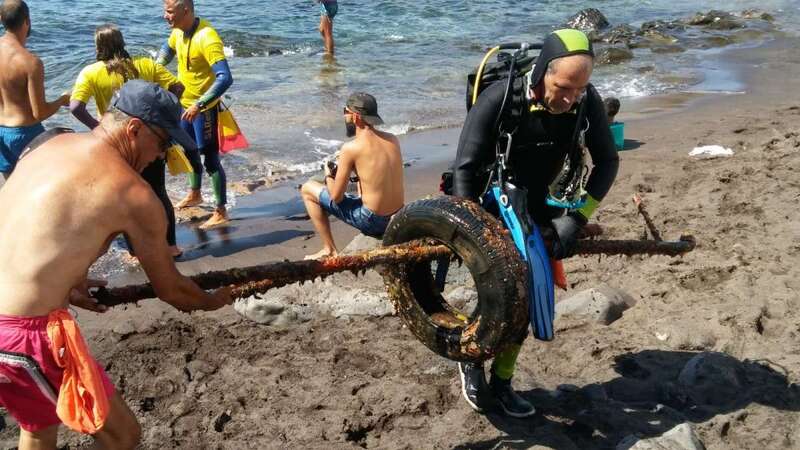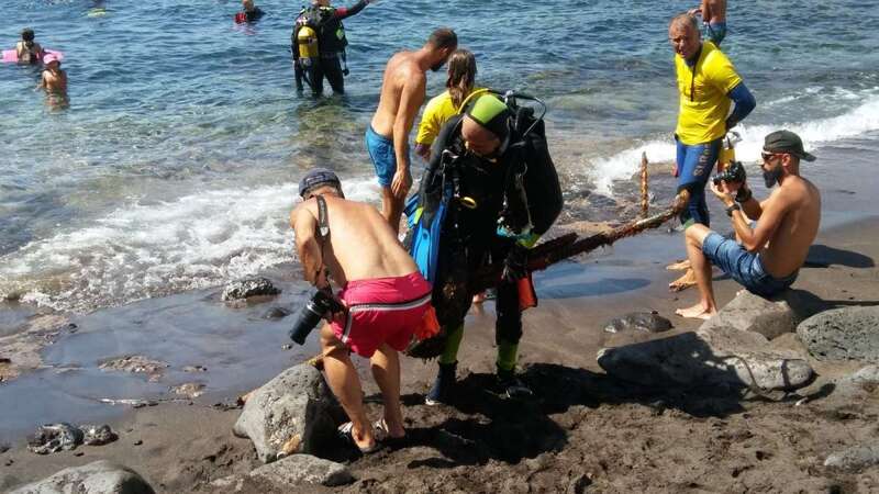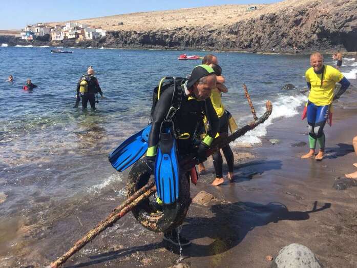 Telde.- La operación de limpieza de la playa de Tufia extrajo este sábado de sus fondos marinos unos 100 kilógramos de restos de embarcaciones (anclas, sogas, etcétera), aparejos de pesca, silllas, neumáticos y otros residuos. TA avanza imágenes.