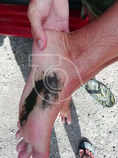 Un usuario muestra la mancha negra en su pie tras caminar por la arena de Playa del Hombre (Foto TA) Un usuario muestra la mancha negra en su pie tras caminar por la arena de Playa del Hombre (Foto TA)