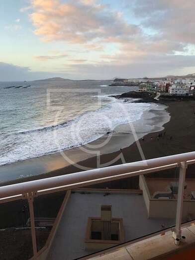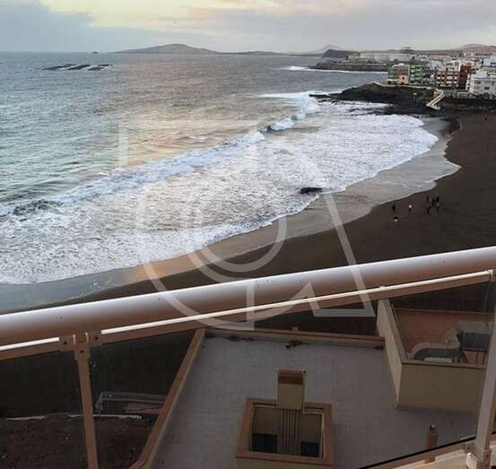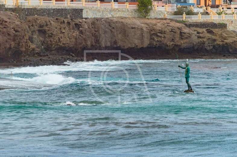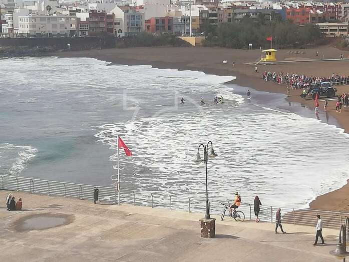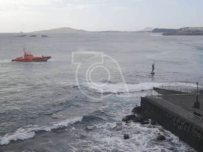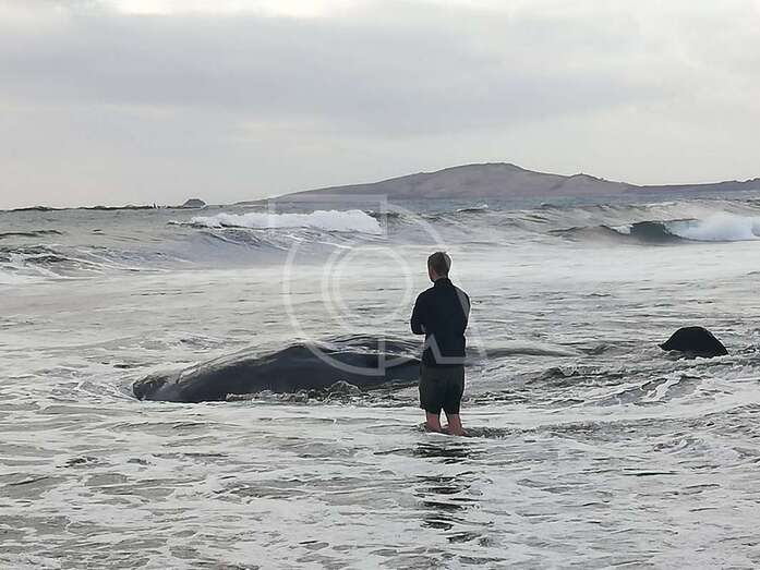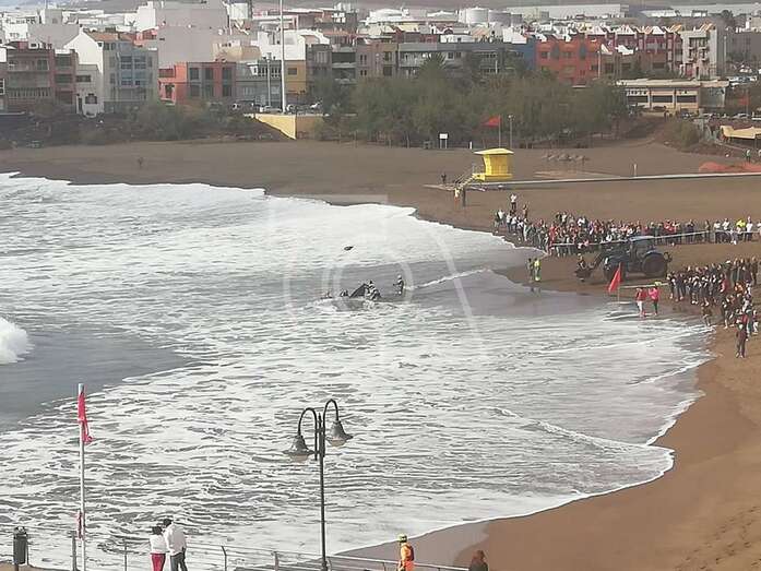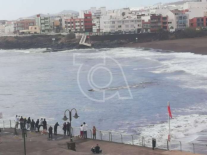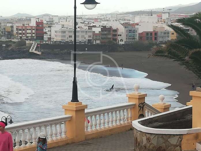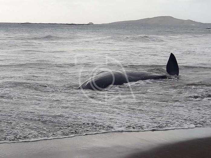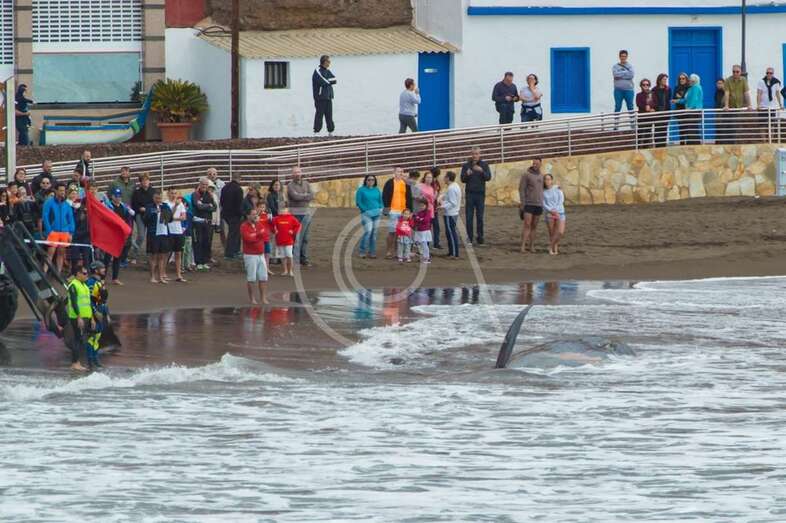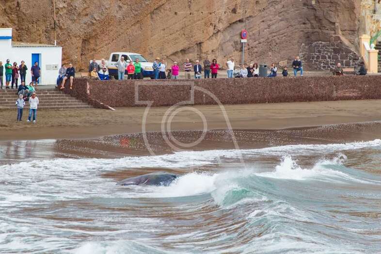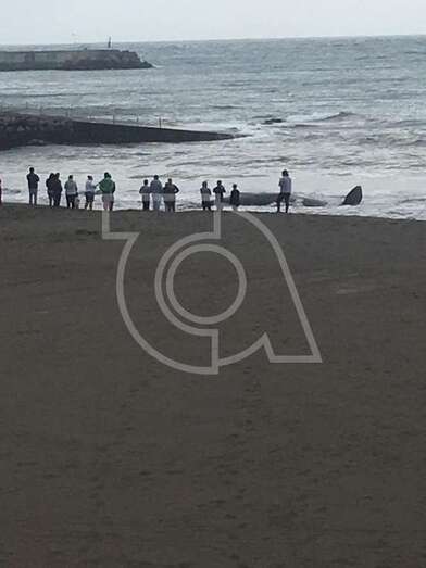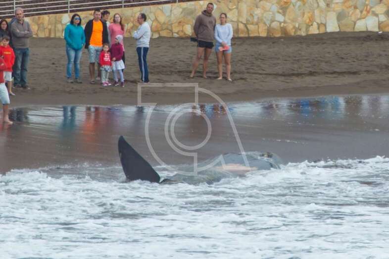 Hasta el lugar acudieron efectivos de la Policía Local de Telde y muchos que se acercaron a la orilla de la playa para ver al animal, sometido a los movimientos del oleaje.