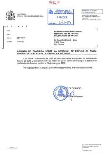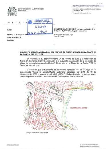 Telde.- La Demarcación de Costas de Canarias ha aclarado al colectivo ecologista Turcón que el edificio de El Timón, en La Garita, no se encuentra en zona de dominio público, por lo que no está en un ámbito territorial que sea de su competencia y, por tanto, no le corresponde a este organismo, dependiente del Ministerio de Transición Ecológica, autorizar o no las obras de remodelación en el inmueble.