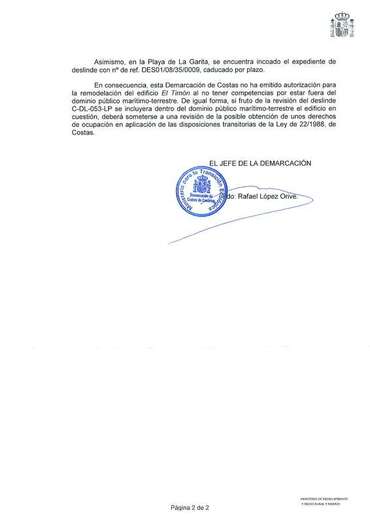 La demarcación canaria no solo advierte de que El Timón no forma parte del demanio público del deslinde aprobado en la playa en diciembre de 1985, sino que añade que, en caso de que sea revisado y entonces el edificio sí fuera incluido dentro del domino público, tendría derecho a las obtención de unos derechos de ocupación.