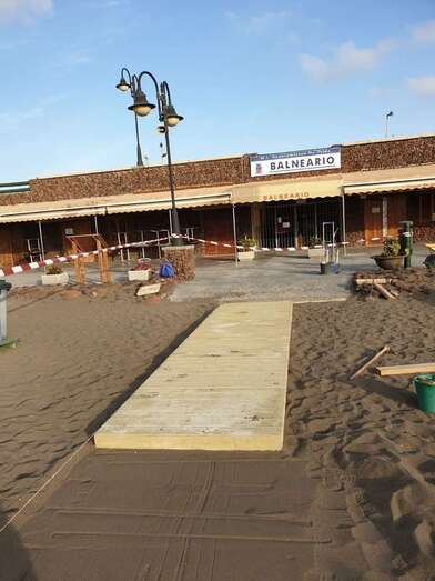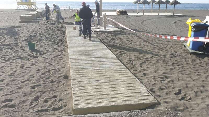 Playas ha instalado 40 metros lineales de pasarelas de hormigón armado de textura antideslizante, imitación madera envejecida, con un excelente comportamiento térmico y gran adaptabilidad al terreno. Cada placa recantagular pesa 400 kg.