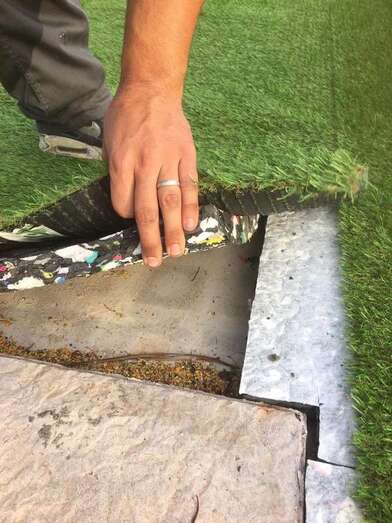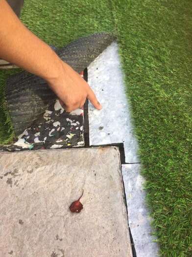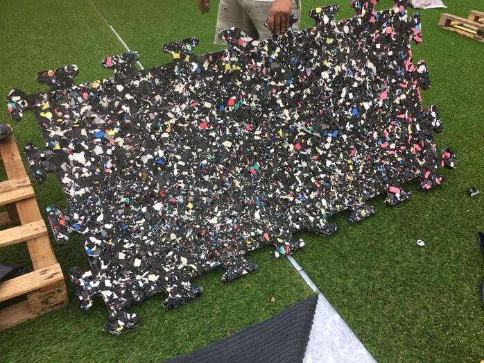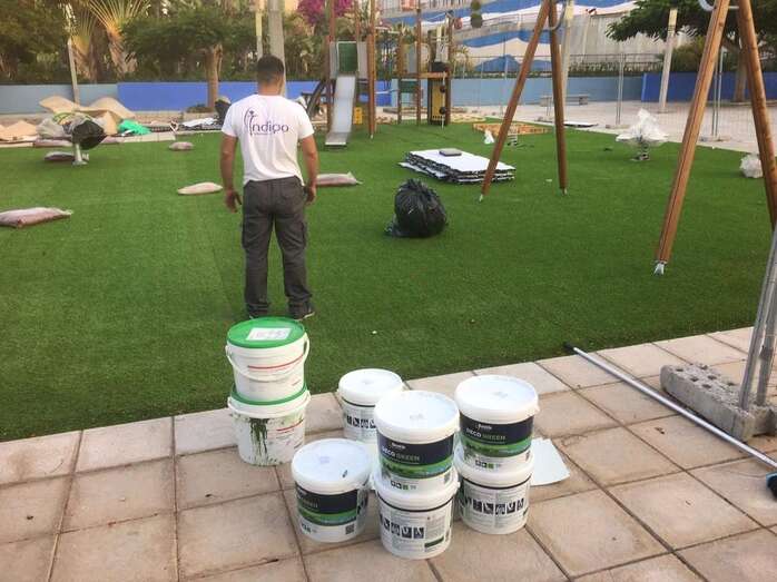 Monzón apunta que bajo el césped se ha instalado una base amortiguadora "de aglomerado de polietileno reciclado, un material de excelente compresión, anti-impacto y drenaje". Además, como medida de seguridad adicional para los menores, en las zonas de mayor altura de posible caída –dependiendo de los juegos – el espesor del pavimento amortiguador es superior, tal como establece la normativa.