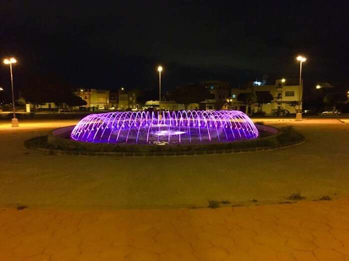 La fuente de la Vega, iluminada de color violeta (Foto TA) La fuente de la Vega, iluminada de color violeta (Foto TA)