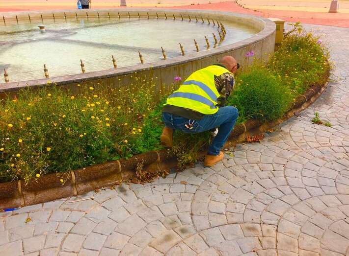 La iluminación violeta de la fuente es la única actuación que esta delegación en este entorno urbano. En los últimos días, operarios de Parques y Jardines llevan a cabo tareas de limpiezas de las especies invasoras y gramíneas que crecen en los aledaños de parterre, alcorques y plaza.