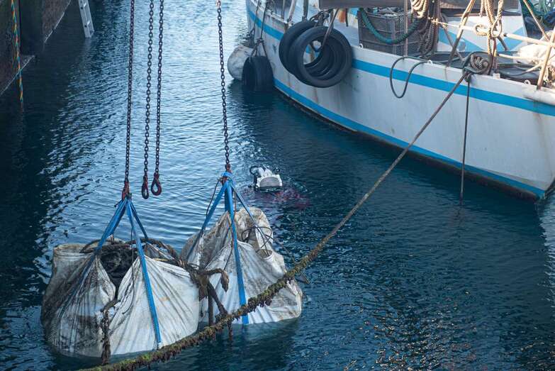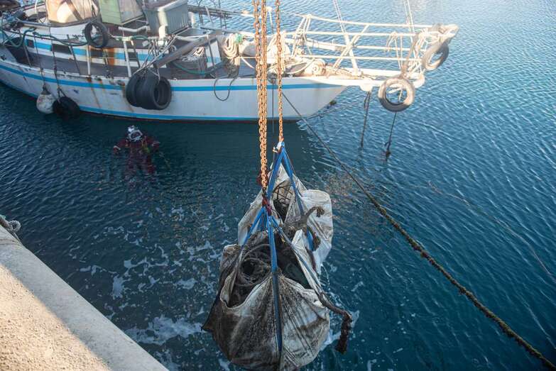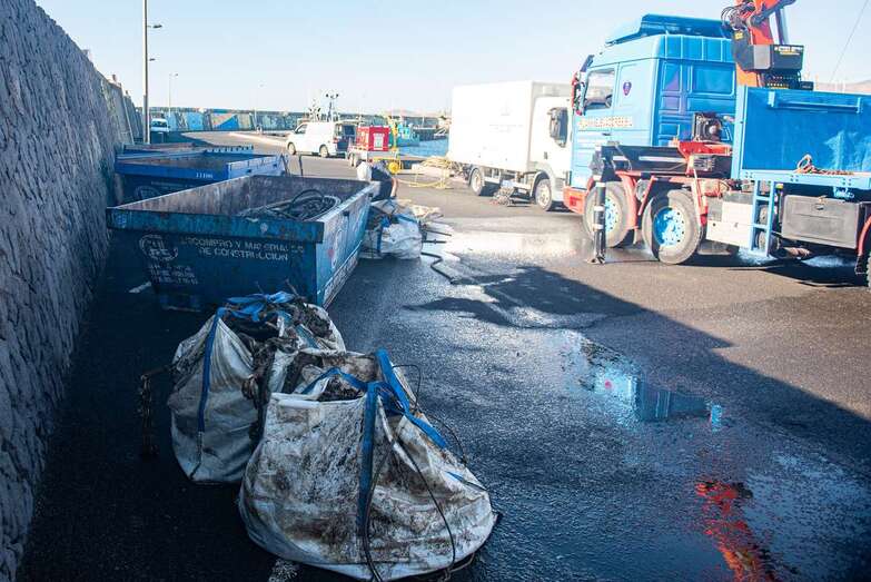 El izado de las sacas es la culminación del trabajo previo durante toda una semana de los buzos, que se han encargado de agrupar los materiales arrojados deliberadamente al mar o desprendidos de las embarcaciones a lo largo de los años.