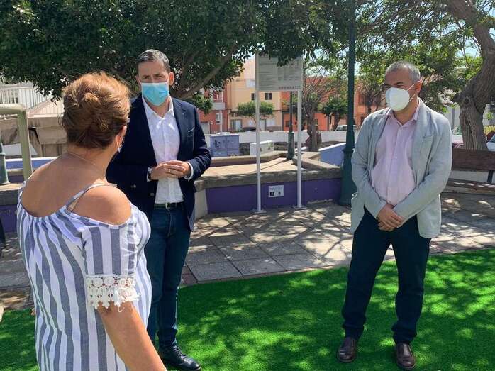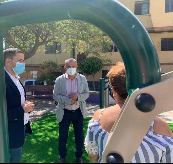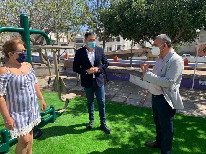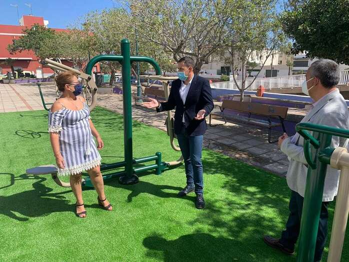 El alcalde de Telde, Héctor Suárez, ha visitado hoy junto al concejal de Parques y Jardines del municipio, Álvaro Monzón, y la presidenta del colectivo vecinal Valdemontes, Mari Paz Monzón, el barrio de La Montañeta, en El Calero, donde el Ayuntamiento ha instalado un nuevo espacio biosaludable en la plaza.