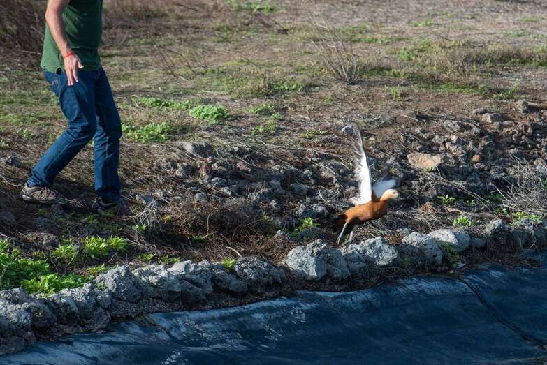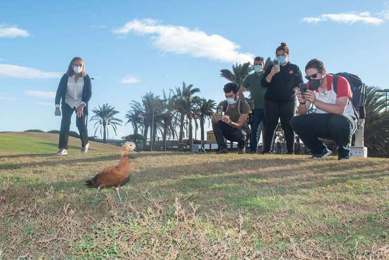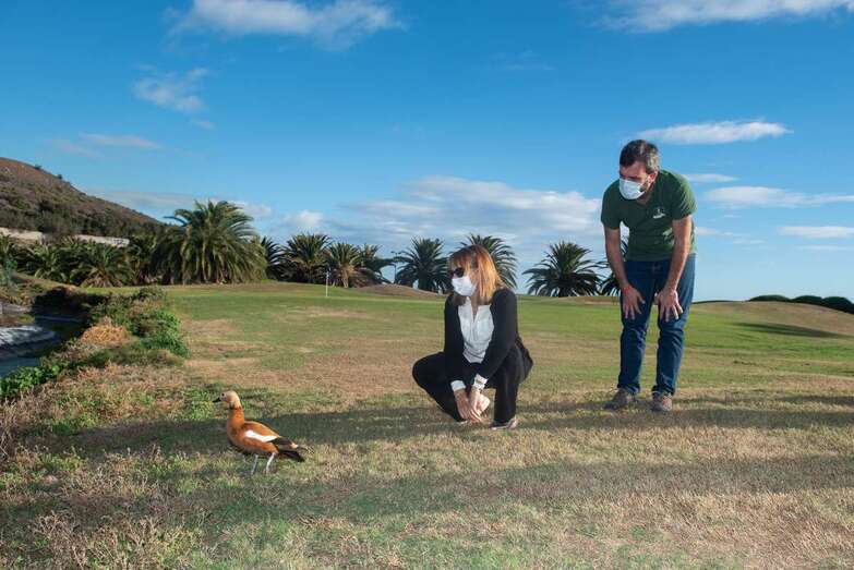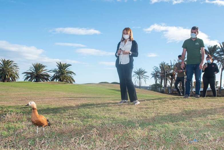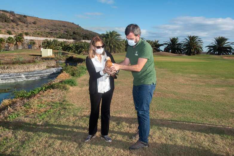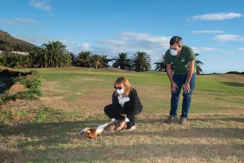 La suelta tuvo lugar junto a una charca del campo de golf de Telde, uno de los humedales donde nidifica la especie en Gran Canaria y donde lo primero que hizo el tarro canelo en cuanto fundó sus patas en el césped fue batir con fuerza sus alas, lo que corroboró la correcta adherencia de los injertos y con ello el éxito de la devolución de un animal a su hábitat natural, destacó la consejera de Medio Ambiente, Inés Jiménez.