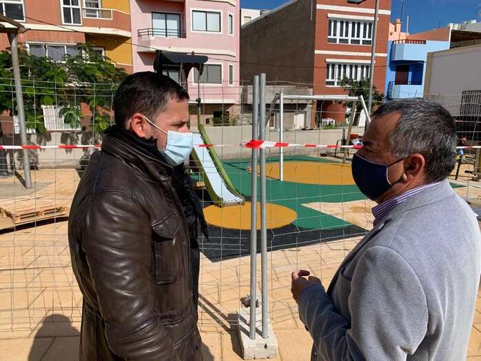 Telde.- El alcalde de Telde, Héctor Suárez, y el concejal de Parques y Jardines, Álvaro Monzón, supervisaron estos días, en la plaza de Clavellinas, el parque infantil donde el Ayuntamiento ya trabaja para su recuperación.