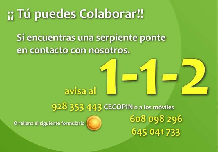 Cabe recordar que el Gobierno de Canarias y Cabildo se han unido para acabar con la expansión de la culebra. Además, ambas administraciones, junto al Ayuntamiento de Telde, solicitan la colaboración ciudadana para que en cuanto se encuentre algún ejemplar se avise a las autoridades y se pueda hacer capturar o hacer seguimiento de la misma. Así, se pone a disposición de la ciudadanía los siguientes teléfonos de contacto: 112 o 928.35.34.43 / 608.09.82.96 (Cecopin).