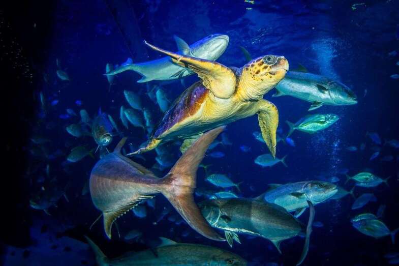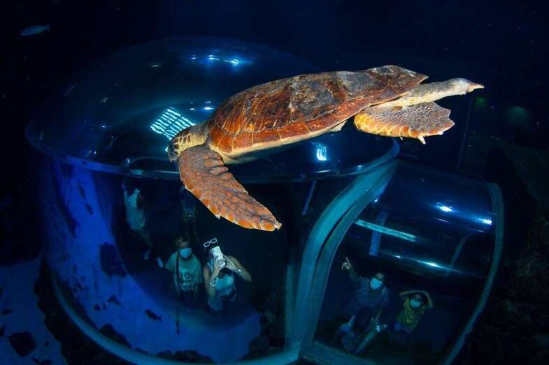 Una tortuga encontrada en estado crítico se recupera en Poema del Mar antes de ser devuelta al mar. Recientemente, este gran ejemplar, de más de 70 kilos de peso, fue trasladado desde la zona médica del acuario hasta la exhibición Deep Sea, donde permanecerá hasta que pueda ser liberada.