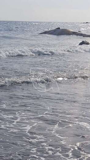 Las corrientes han ido acercando a la ballena de unos 15 metros hacia la orilla de la playa, de hecho ya se encuentra a muy poca distancia, varada sobre unos callaos. Los vecinos incluso han podido observar que el animal presenta varios cortes, posiblemente ocasionados por la hélice de alguna embarcación, y que se encuentra boca arriba y con parte de las vísceras fuera, confirmando además que está muerto.