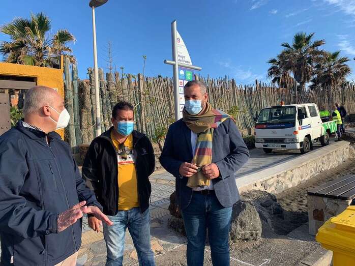 Jonay López, que visitó las playas este martes junto a personal de la Concejalía para comprobar el desarrollo de los trabajos, afirma que “es destacable el cambio que ya puede percibirse tanto en Hoya del Pozo, -con un nuevo muro, el puente restaurado y la zona de jardín limpia y reorganizada-, así como en La Garita, en donde se trabaja para renovar el frontal de la avenida marítima lijando y pintando el vallado de madera”.