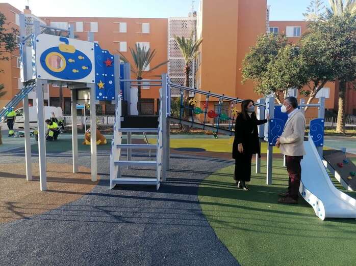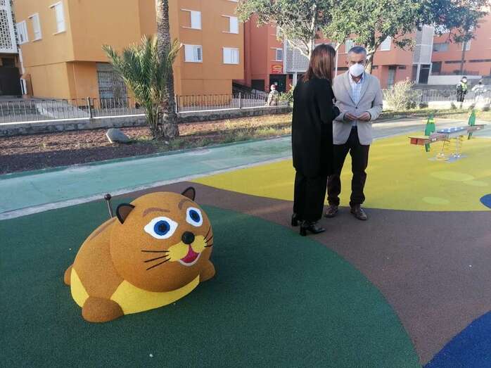 La alcaldesa de Telde, Carmen Hernández, y el concejal de Parques y Jardines, Álvaro Monzón, visitaron este miércoles el parque infantil de Las Remudas, donde se ha culminado la instalación de los nuevos aparatos infantiles con juegos combinados adaptados a la normativa europea y un pavimento continuo de llamativos colores, además de una mesa de picnic y bancos para que este espacio se convierta en un lugar para que toda la familia disfrute.