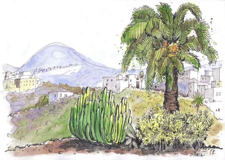 Una decena de metros más y la calle da paso al verdor en la ladera de la montaña. Una curiosa señal vertical nos indica el camino con expresiones canarias muy populares. Se trata de un trabajo en hierro donde, sobre las pencas metálicas de una pita, se señalan dos direcciones posibles, la primera flecha presenta su punta direccional hacia la ciudad y perforado el metal gracias a un taladro, se interpreta el término: “Pa´bajo”. Sobre este rótulo aparece otro, con la punta direccional en sentido contrario, señalando el camino hacia la cima de la montaña. En él está escrito con la misma técnica de agujereado: “ Pa´arriba” y sobre ambos, la silueta de un senderista con un bastón, a punto de iniciar la subida en busca de la cima de la montaña.
