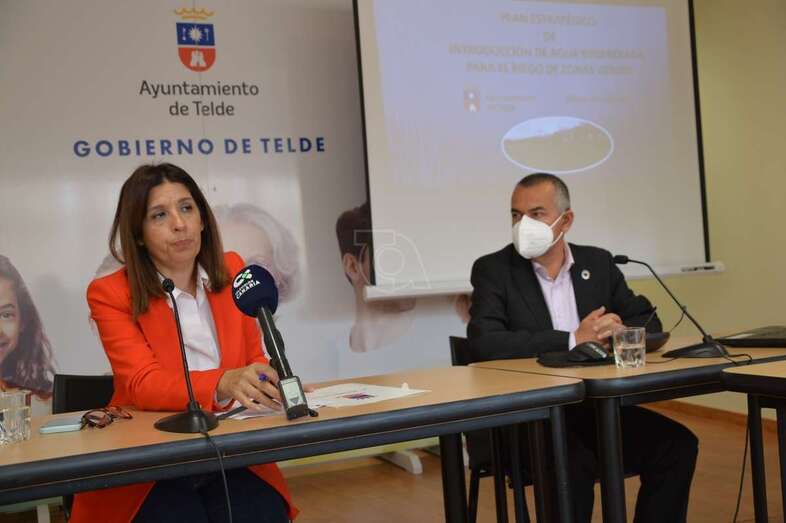 La alcaldesa Carmen Hernández y el concejal del área, Álvaro Monzón, explicaron este mediodía en una comparecencia informativa que este proyecto, uno de los 125 proyectos presentados por el Ayuntamiento a los Fondos Next Generation y que el Gobierno de Canarias ha considerado importantes, se sustituirá el 77,3% del agua blanca que actualmente se usa para el riego de las zonas verdes públicas de Telde regenerada, lo que supondrá un ahorro anual mínimo -según los cálculos de los técnicos- de 177.955 euros, dado que el metro cúbico de agua blanca se paga a 1,10 euros, mientras que el agua regenerada se compraría al Consejo Insular de Aguas por 0,40.