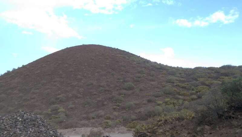 A pesar de la basura, es esta la vía de acceso al yacimiento que les quiero acercar pues es segura y práctica. Junto a los residuos se inicia un marcado sendero que, llaneando entre vegetación, nos permite bordear el cono y salir del mismo al pie de su cara oeste. Precisamente por esta cara oeste tendríamos la otra vía para acceder al cono. Seguiríamos carretera arriba en dirección a la Planta de Tratamiento de Residuos Sólidos y apenas recorrido un centenar de metros, nos desviamos a la izquierda en la primera salida. Un enorme socavón en la montaña es el inicio al camino que nos conduce igualmente a la boca del volcán.