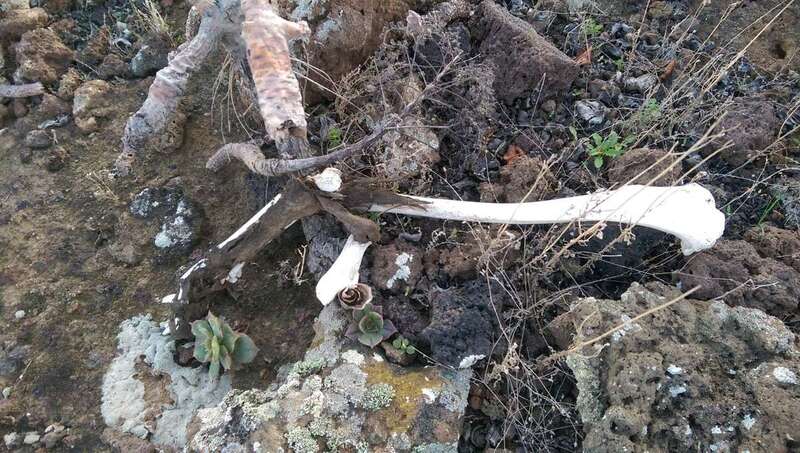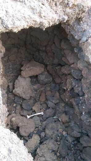 Me sorprende el avistamiento porque no concibo negligencia ni abandono tan palpable, tan lacerante, tan desgarrador y triste y, retirándome en silencio, allí se queda y permanece, con total seguridad un vestigio orgánico de un pasado olvidado. Quiero pensar que no es un hueso perteneciente a un cuerpo aborigen, pero la duda toma cuerpo cuando en otra cista próxima, observo un hueso más largo con la forma y el tamaño de un hueso de un brazo humano, cubierto en parte por lo que pudiera ser un trozo de piel seca. Le saco varias fotos y allí permanece, junto a la cista. Ni siquiera necesito aproximarme. Muy próximo, otro amontonamiento de piedras que puede significar un vestigio de otro amurallamiento, ahora desaparecido, que protegía la necrópolis por el este. Ante estos hechos, visibles y palpables, una pregunta asalta mi mente: ¿Quedarán túmulos sin excavar? Y si la respuesta fuera afirmativa ¿De qué tipo de vigilancia ante posibles expoliadores goza esta necrópolis?