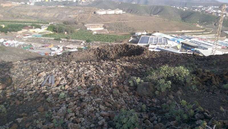 Es esta la orientación que tomó la lava en su descenso. Así se observa claramente en el cráter y como tal se intuye entre la vegetación que cubre la lengua lávica hasta detenerse y perderse bruscamente bajo la cimentación y los muros perimetrales de la última nave industrial que ha escalado la montaña.