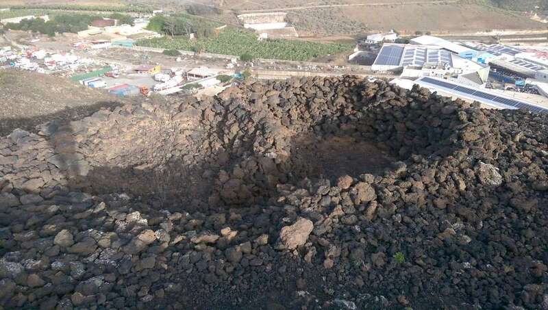 Con orientación norte la montaña está mordida hasta mitad de su ladera por los desmontes necesarios para ubicar una serie de naves industriales que la rodean por sus caras norte y este. Entre las naves observamos una serie de vías asfaltadas que facilitan la comunicación, y más abajo discurre la Cañada del Perro, un valle que desagua sus esporádicas aguas en el barranco de Jinámar, cañada a donde llegó el derrame lávico de la montaña pero que ha desaparecido sepultado por la urbanización industrial, las fincas agrícolas y los recintos ganaderos. Urbanización que registra el nombre de Maipez, rescatando en cierto modo la toponimia del lugar, un malpais por donde se extendía la necrópolis cuyos últimos vestigios observamos en el cráter. No en vano se encontraron vestigios prehispánicos por el malpais del barranco que discurre al pie de este cono. Hay caballos y cerdos estabulados en la cañada, también gallinas y gallos que despiden con su cacareo los últimos vestigios de la noche en la montaña.