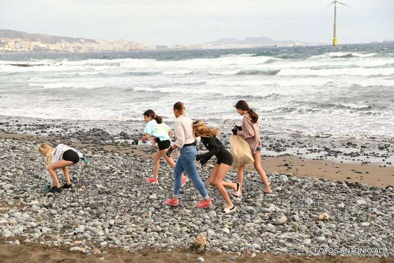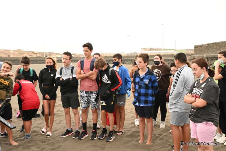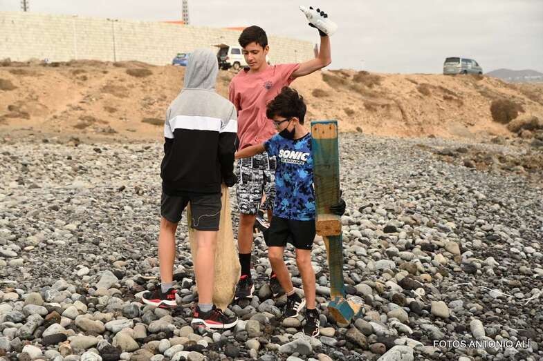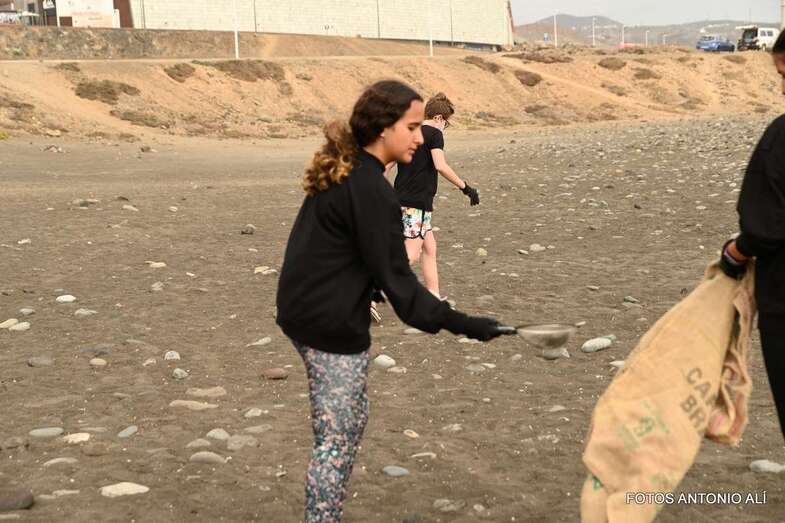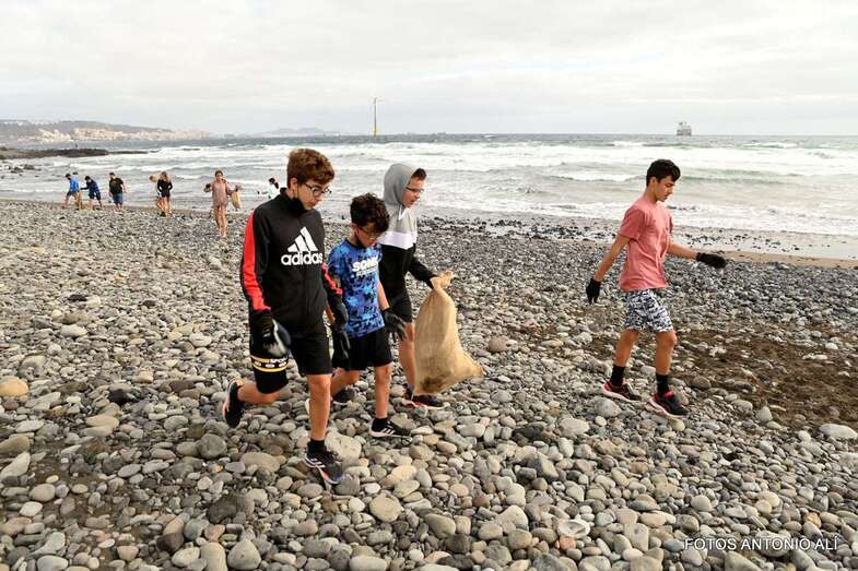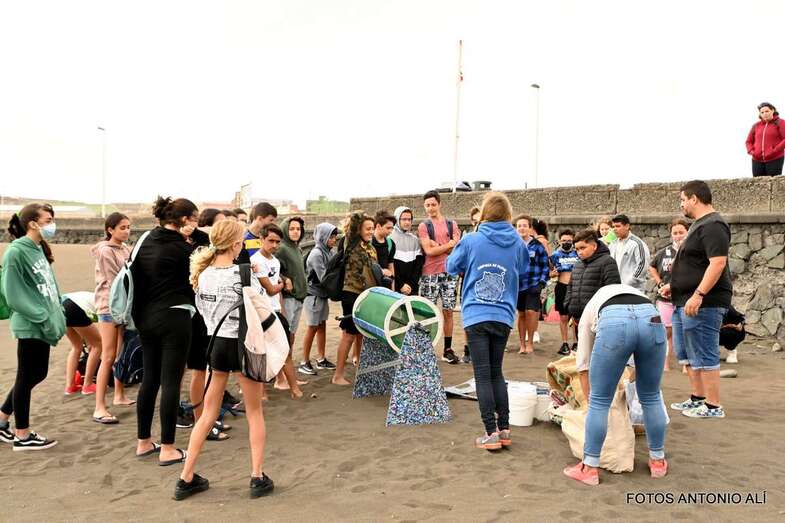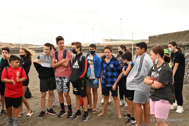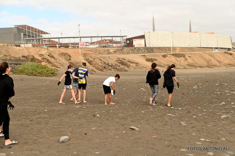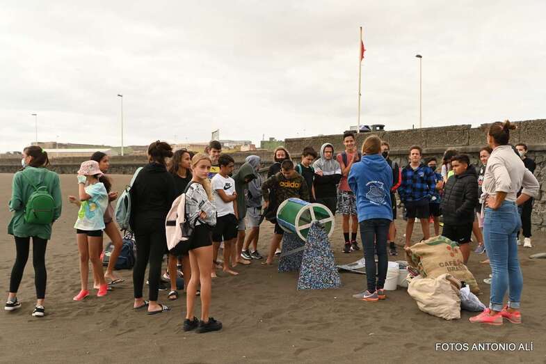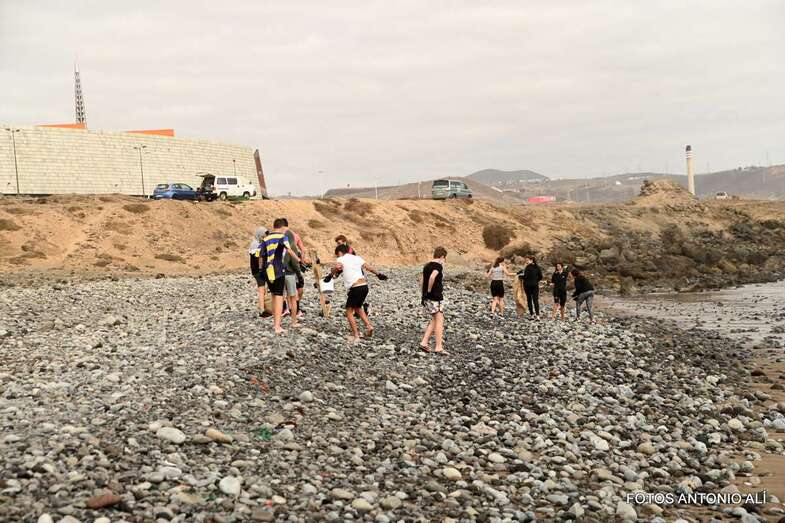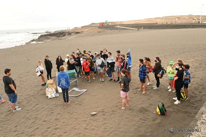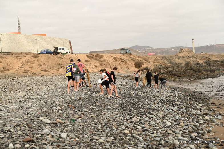 Alumnos de 1º de la ESO del IES El Calero de Telde llevaron a cabo este lunes junto a la ONG Oceans 4 Life una limpieza de plásticos y otros residuos en la playa de La Restinga, en la costa de Jinámar.