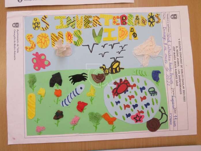 En esta iniciativa, enmarcada en la formación escolar la Escuela Verde que en el curso escolar que acaba se desarrolló bajo el título El Reino Animal: los invertebrados, el segundo premio recayó en el trabajo El mundo de los invertebrado, que incluye la frase reivindicativa Si los extingues, nos extingues a nosotros, una obra del alumno Nael Echedey Morales Morales, de 11 años, que cursa sexto de Primaria en el CEIP María Jesús Ramírez Díaz.