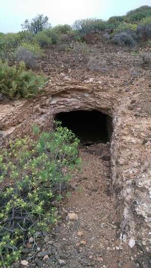 Nos sorprende, al llegar al pie de la misma, la existencia de una galería. Curioso, accedo a su interior, pensando en una cueva o en la improbable posibilidad de una galería de agua, pero observo que a una veintena de metros el túnel, tras un corto repecho, sale de nuevo al exterior. Sabré luego, tras la búsqueda de información referente a las infraestructuras militares teldenses, que este túnel se fabricó con la intención de servir de polvorín a las baterías antiaéreas que coronaron la montaña.
