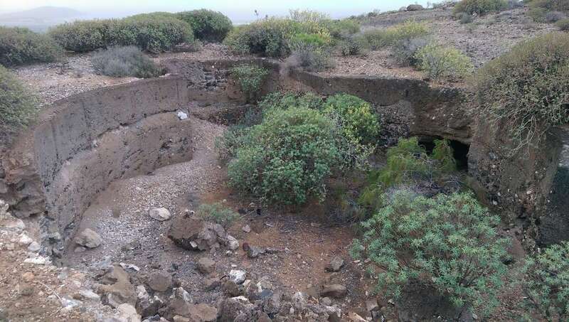 Llevando la mirada al naciente, la costa de Gando y las llanuras que se extienden sin discontinuidad alguna hasta Vargas conforman el paisaje que se nos muestra en el litoral. Es en esta dirección por donde desciende suavemente la loma de la montaña hasta alcanzar la montaña Colorada. En el trayecto, dejando a mi espalda las baterías militares, observo un estanque a cielo abierto en buen estado. Es cierto que el abandono al que está sometido ha provocado un incipiente deterioro en sus muros y que, antes o después, tanta desidia arruinará la seguridad y estanqueidad de su obra, pero no es menos cierto que su interior mantiene aún el albeo de cal que en su día impermeabilizó sus paredes y uno alberga, cándidamente, la esperanza de que, en algún momento, alguien ponga en valor estas obras de alto valor etnográfico,