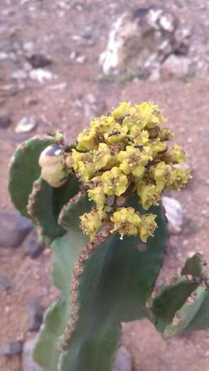 Aquí, en la ladera norte de Rosa Damián, entre la montaña de las Tabaibas y la montaña Colorada, las plantas son jóvenes, no así las plantas madres de donde proceden, pues en la misma finca, en la cañada de Lomo Cabral, las Euphorbia candelabrum presentan varios niveles de ramificación y alturas cercanas a los cinco metros. Curiosa novedad la del uso de esta Euhorbia, pero la utilización de plantas foráneas para delimitar fincas no es nada nuevo. De todos es conocido el uso de diferentes especies de pitas y de tuneras para realizar similar función. También lo fue el uso de palmeras canarias y tarajales, incorporando de tal modo la flora canaria al paisaje agrícola de las medianías y la costa teldense.