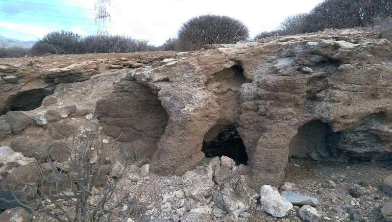 Indicábamos antes que a la montaña de Malfú se accedía por la pista asfaltada que desde la GC-100 baja hasta unirse con la carretera que une la GC-1 con Ojos de Garza. Si venimos de Malfú de abajo, entre invernaderos, fincas y un campo de paneles solares, observaremos a pie de carretera, en la cara norte de la montaña una serie de cuevas. No sé de su importancia, pero poseen un hueco o ventana de comunicación dos de ellas y un lucernario o hueco en el techo una de las cuevas. Su proximidad a la carretera es la razón por la que tienen basuras en su interior y en el espacio amurallado que protege su entrada. De cualquier modo, es una vergüenza para las autoridades locales el estado en que se encuentran pues una puntual campaña de limpieza resolvería el problema.
