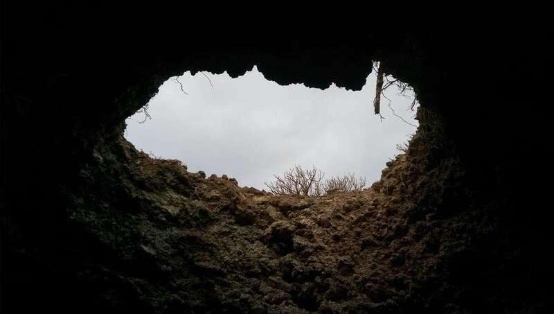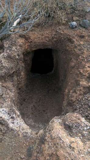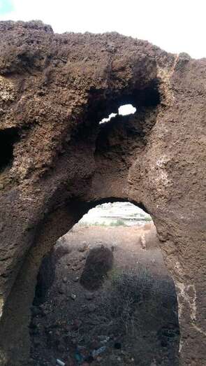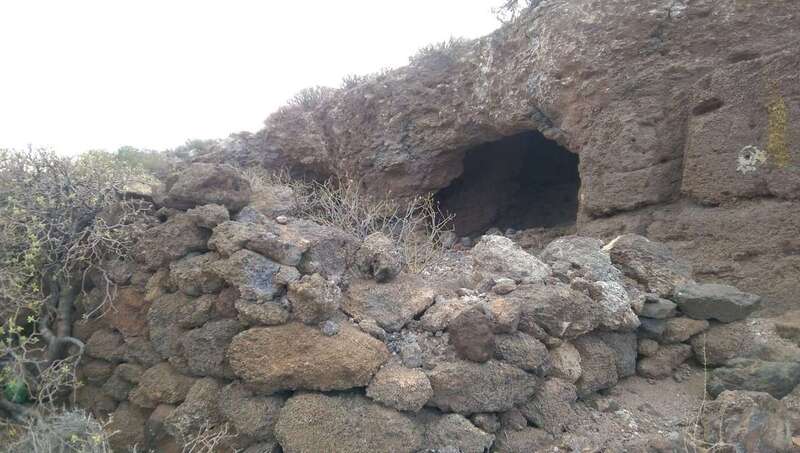 La lectura paisajística de proximidad me lleva, a muy pocos pasos de la cruz, a observar una hondonada que permite visualizar unas cuevas. El acceso a este complejo está más abajo, bordeando este enorme socavón. Dando un pequeño rodeo -necesario por seguridad-, seguimos descendiendo. Una depresión antecede a una amplia cueva labrada en un sustrato muy inestable de materiales escoriáceos apelmazados. Es amplia su entrada y la cueva nos permite acceder, gracias a unos peldaños excavados en el material piroclástico, al interior del socavón antes referenciado. Las basuras que observamos son el ejemplo más plausible de la indiferencia de algunos seres humanos ante nuestro patrimonio aborigen, de la falta del respeto hacia el medio natural donde está emplazado y una demostración de incultura e ignorancia que es preciso abordar desde propuestas educativas mucho más orientadas al conocimiento y potenciación de los valores naturales, etnográficos, antropológicos de la isla que al conocimiento genérico de otros valores, otras culturas que jamás aportarán una actitud que fortalezca la puesta en valor de nuestros referentes patrimoniales.