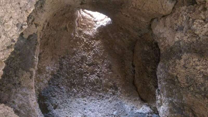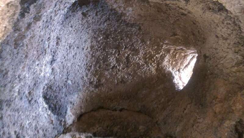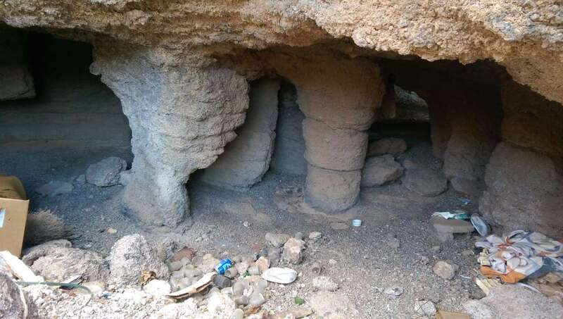 Junto a esta esplanada, sepultada su abertura principal hasta tal punto que sólo un hueco en su parte superior izquierda permite observar su interior y acceder a ella, una enorme cueva labrada en la toba volcánica. Una enorme puerta metálica daba servicio a esta cueva, actualmente oculta tras una montaña de tierra que la sepulta y oculta literalmente. Alguien hizo un butrón en el material escoriáceo de uno de los lados de la puerta, facilitando el acceso a la misma. No hay duda por los colchones y restos varios que hay en su interior que esta vivienda cueva estuvo ocupada un tiempo. Quiero pensar que de aquí se extrajeron sillares pues el material es el adecuado para su explotación minera. En su interior observo una gran sala, un enorme y amplio pasillo central da servicio por la izquierda a un habitáculo que hace de cocina y una serie de habitaciones y por la derecha a un baño y otra serie de habitaciones hasta completar el número de nueve estancias. Esta sala distribuidora, a modo de pasillo, tiene unos cuarenta metros de profundidad, unos cinco de ancho y tres de alto. El caso es que baño y cocina estuvieron alicatados y contaron con servicio de agua que se la proporcionaba un aljibe que, cerca de la oquedad de entrada se conserva aún. No sería descabellado pensar en un aprovechamiento militar. Polvorín, habitaciones de pernocta… La trinchera se encuentra a una decena de metros de esta entrada.